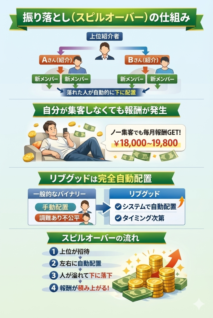 - 「振り落とし(スピルオーバー)」は自動配置によって傘下会員が増える仕組み